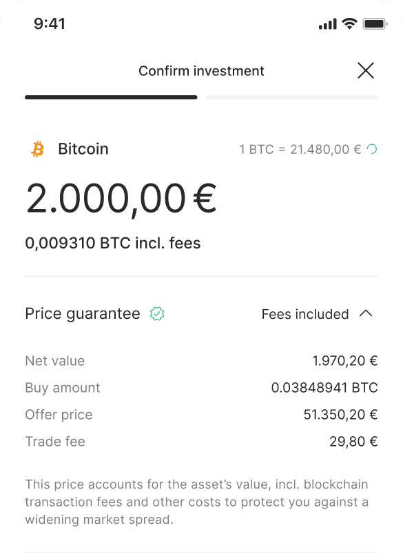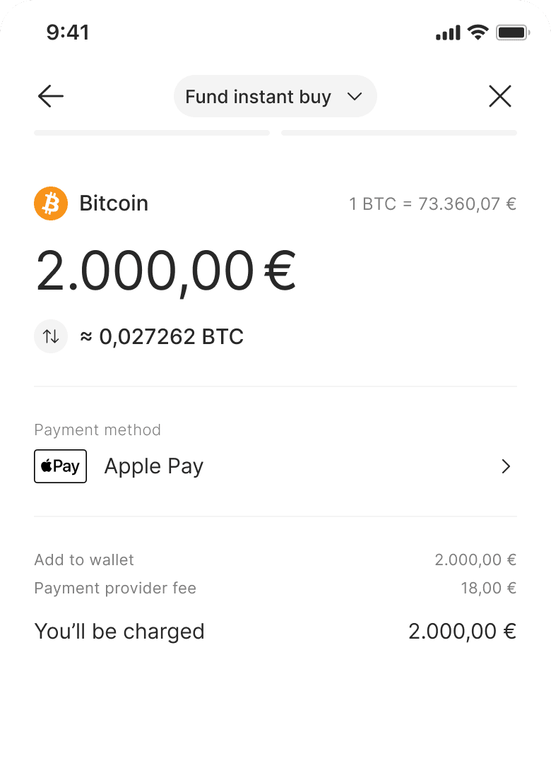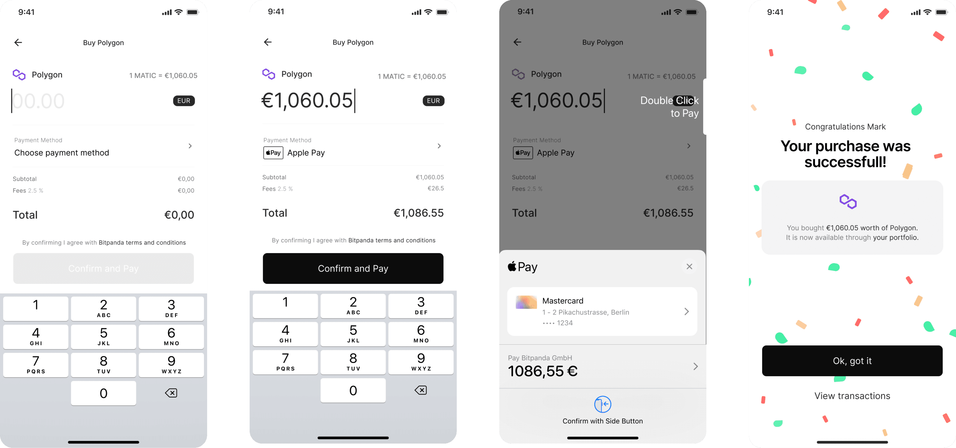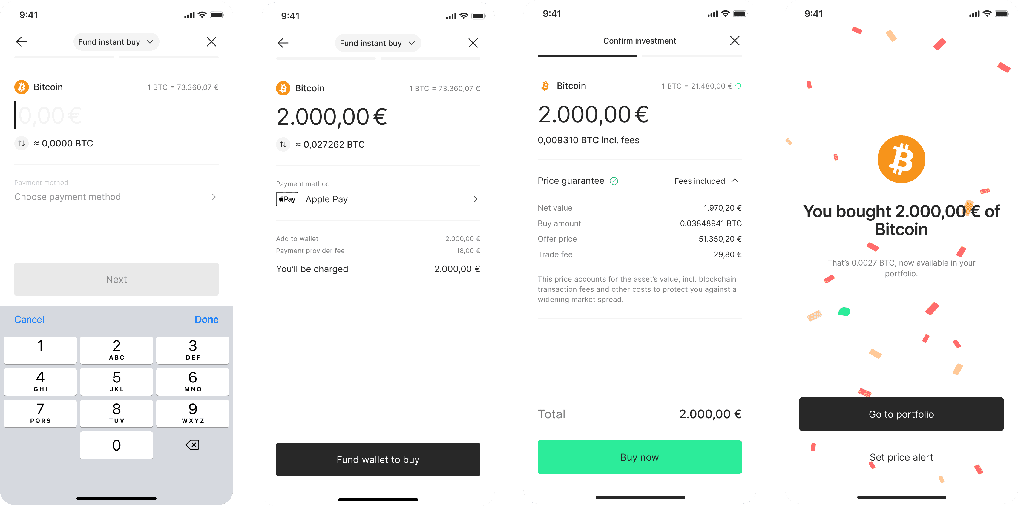 The final flow was divided in two steps, so cannot be said that is a seamless experience anymore. The user would define how much they want to buy and what payment method they want to use first. After the payment is processed, they would arrive to the "confirm investment" screen where they can then confirm the trade.