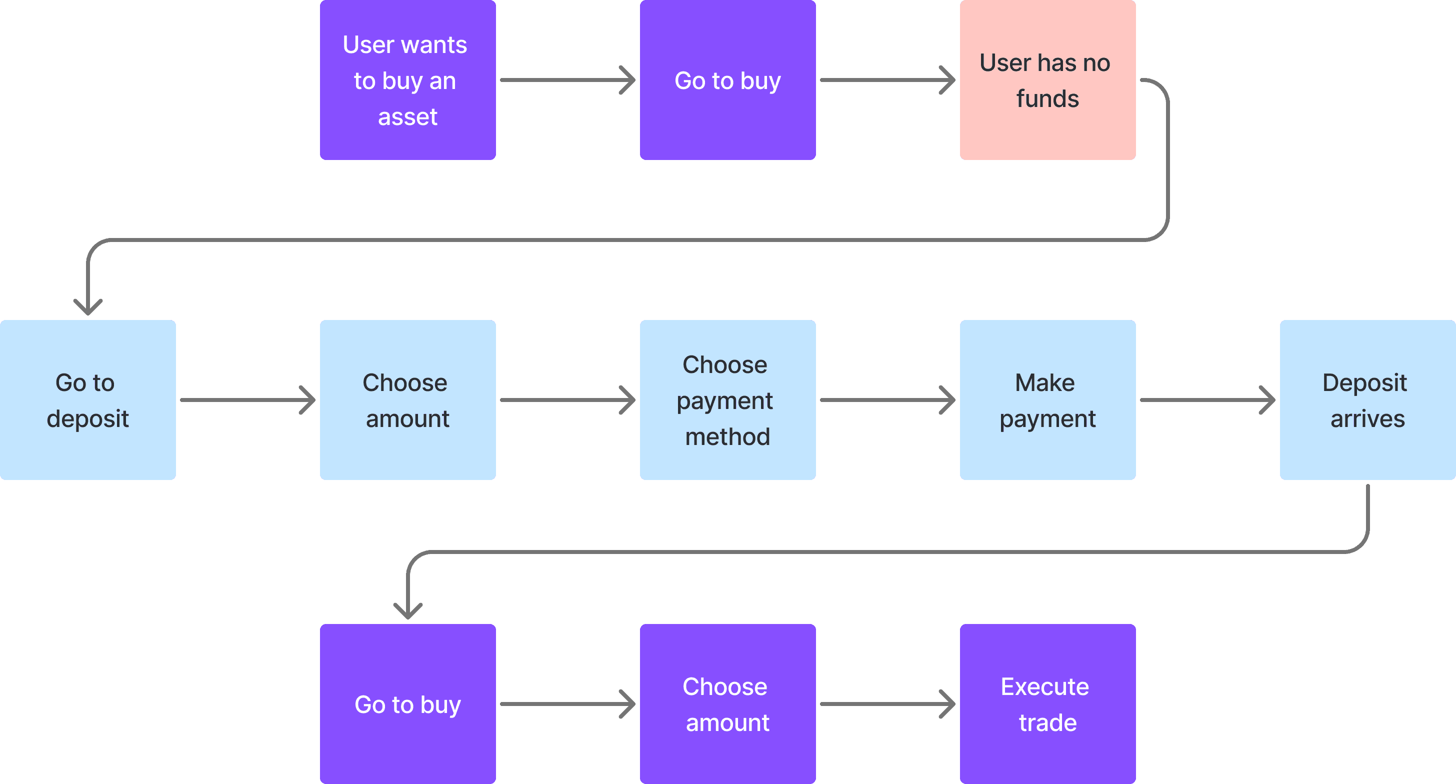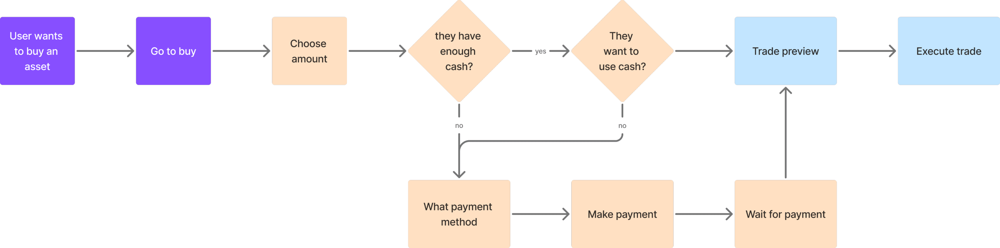 The idea was to allow the user to deposit and buy in a single, seamless flow. The user would just buy whatever amount of an asset they wanted and in the background the payment would be processed, added to the user's account and then execute the trade. For them, just like buying socks in Amazon; for us, a deposit that instantly became a trade.